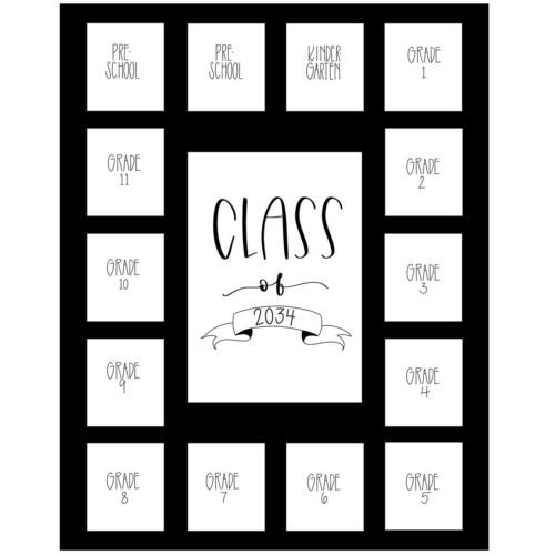The Class of 2035 center frame includes wallet-sized spaces for photos from pre-school to 11th grade, along with a center space for the graduation photo. Perfect for personalized graduation party decorations.