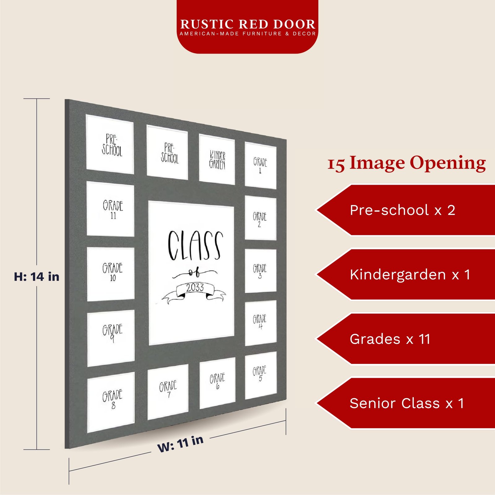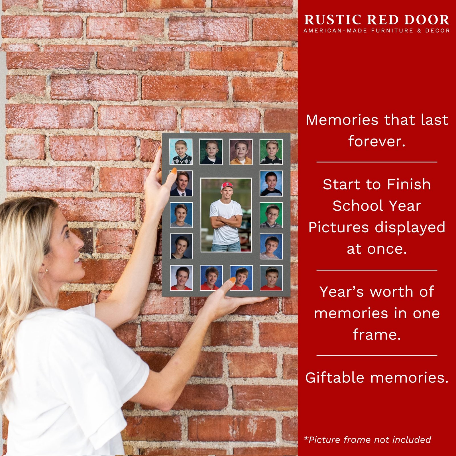 Warmly reminisce on your child’s younger years with Rustic Red Door’s photo collage frame mat. The mat is designed with spaces for 15 photos from pre-school through graduation, creating cherished memories with your child.