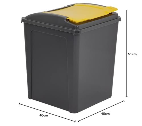 This set includes 3 x 50-litre recycling bins, featuring one red, one yellow, and one blue bin for easy sorting. Each bin has approximate dimensions of: Height: 51 cm, Length: 40 cm, Width: 40 cm.