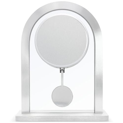 Introducing the Acctim 36757 Bathgate Pendulum Mantel Clock, a beautifully modern timepiece designed to enhance any living space. It boasts a sleek brushed metal case paired with a polished base, creating a sophisticated aesthetic. The clock is elegantly finished with a distinct spun metal dial and a clear glass insert, protecting the intricate details.