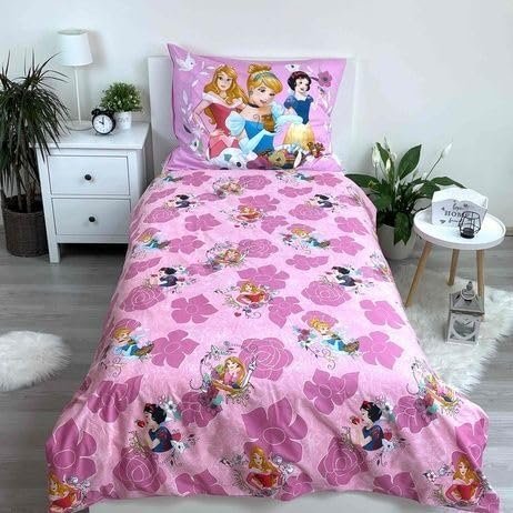Discover the enchanting world of Disney Princesses with this delightful cotton duvet cover. Featuring beloved characters like Rapunzel, Cinderella, and Snow White, this single duvet cover (140 x 200 cm) comes complete with a matching pillowcase (70 x 90 cm), perfect for any single bed.