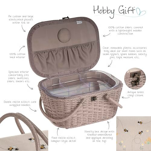 This twin-lid variation features a double-opening lid with an internal pincushion and an elasticated storage pocket for smaller notions and accessories. Customize your work setup by choosing to have one or two lids open while crafting, offering enhanced flexibility and convenience. It also features a removable, clear plastic accessories tray that can be easily detached for use as a neat organizational space on your workspace. The deep, cotton-lined interior is capable of accommodating dressmaking shears, cotton reels, and more, ensuring ample storage space for various crafting supplies. It includes double handles for effortless transportation and smooth metal pivot points for added durability. Available in select fabric options, as well as the Hamper style with faux wicker detailing and faux raffia handles. Dimensions: (D/W/H) 25 x 25 x 17cm, providing a compact yet spacious storage solution for your essentials.