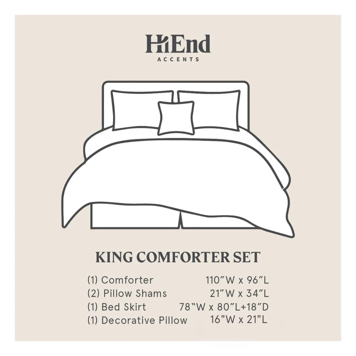 • Feature: King Comforter Set Benefit: Includes 5 pieces – Comforter, Bedskirt, Pillow Shams, Accents