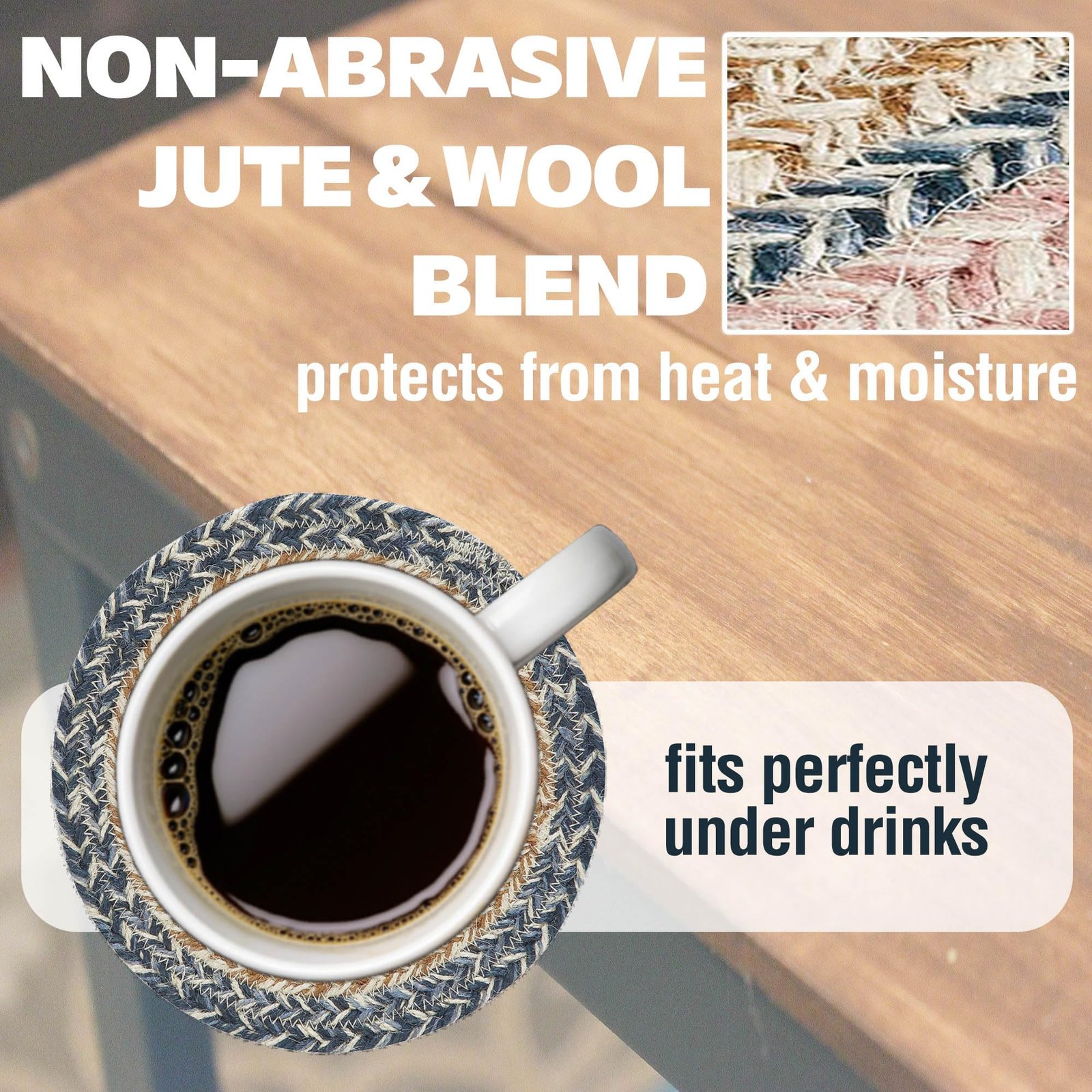 Protect your furniture in style with the Kaila Jute Coaster Set. This set of six 4-inch round coasters features braided jute in blue, misty rose, and creme. The detailed braid adds a homemade feel to your decor. Perfect for country cottage vibes, pair with other items from the Kaila Collection.