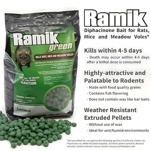 Introducing the NEOGEN RODENTICIDE Ramik Mouse and Rat Nuggets, a powerful and reliable solution for effective rodent control. This 4-pound pouch of green nuggets is engineered as an ultimate all-weather rodenticide, specifically formulated to target and eliminate rats and mice in both indoor and outdoor environments. Its unique wax-free formula ensures consistent performance, making it especially well-suited for use in challenging wet and damp areas where other rodenticides might fail. Trust NEOGEN for robust and dependable pest management.