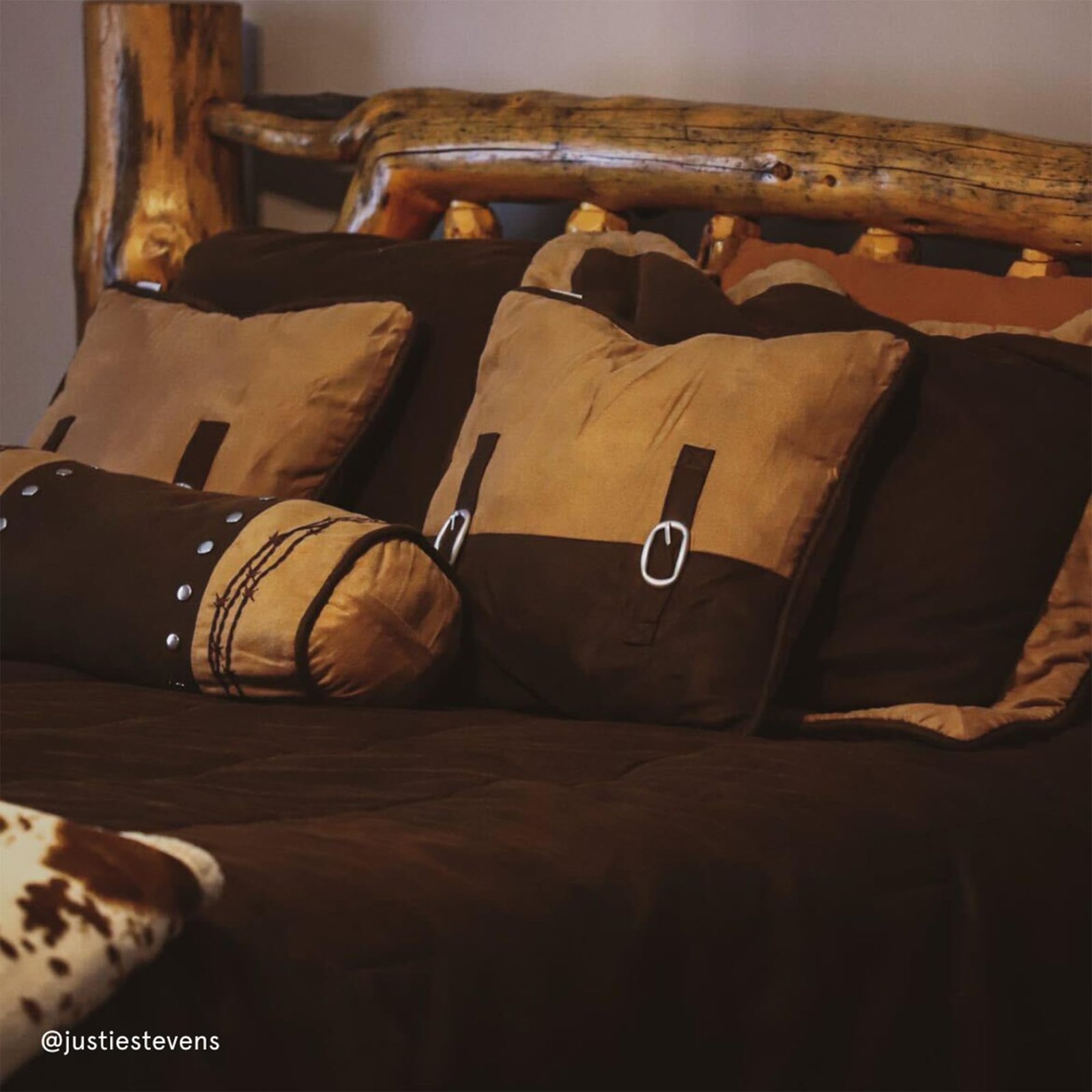 Get lassoed in with Rustic Barbwire’s sumptuous textures and ranch-inspired motifs. Inspired by cattle ranching, Rustic Barbwire brandishes barbwire embroidery on faux leather and suede. Accenting faux leather pillows—finished with authentic buckles and studs—provide a stunning contrast. For a coordinated look, match with our Rustic Barbwire Sheet Set and other Barbwire accessories.