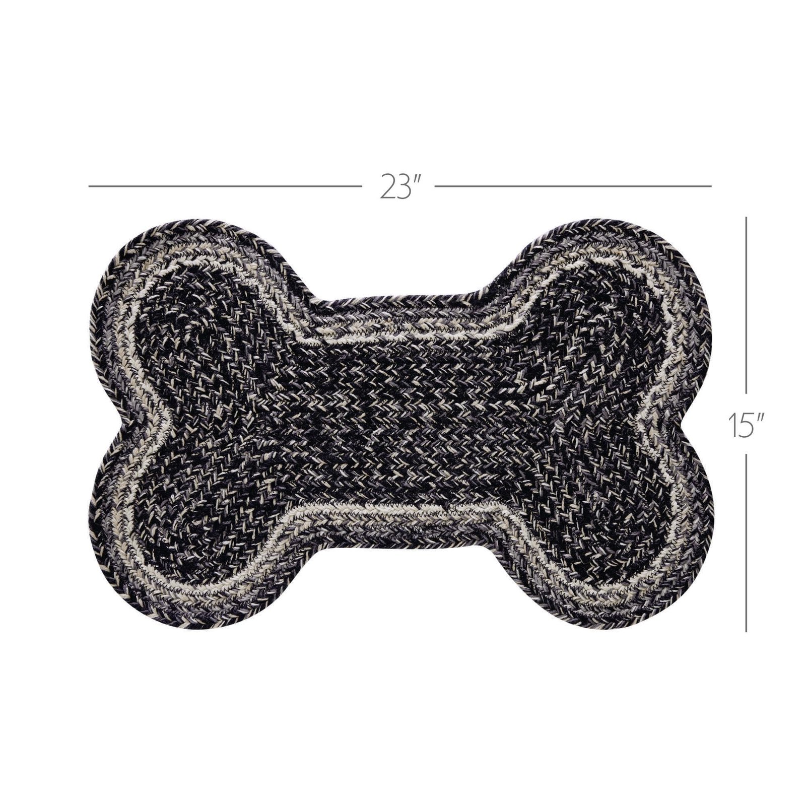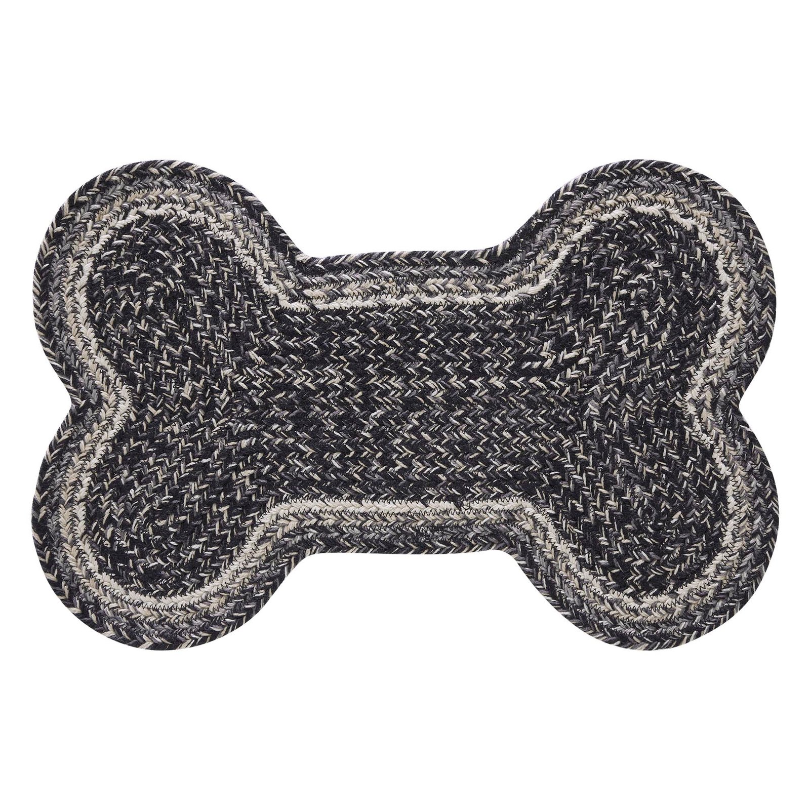 Provide your pet with a stylish and practical rug, the Sawyer Mill Medium Bone Rug, measuring 15×23 inches. Crafted from 100% recycled polyester material, waterproof and durable. Suitable for indoor and outdoor use, perfect for water and food bowls for medium or large breed dogs. Rich caviar black with grey, tan, and creme accents for a modern farmhouse look.