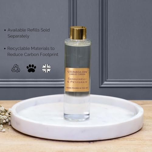 SANGUINELLI & PETITGRAIN: Sanguinelli orange, an intriguing cocktail of sweet, tart, and spicy notes, is intertwined with the fresh, green aromas of petitgrain. Accords of zesty citrus blossom on a base of aromatic eucalyptus and woody patchouli bring a warm, balanced finish. Key points include its highly fragranced 120 ml volume, lasting up to 10 weeks. The product stands 25cm high with reeds and features the distinct SANGUINELLI & PETITGRAIN fragrance. Made in the UK with premium quality ingredients, it’s perfect for living rooms, bedrooms, and bathrooms, boasting an elegant glass design that complements modern decor. This diffuser offers a truly highly scented experience.