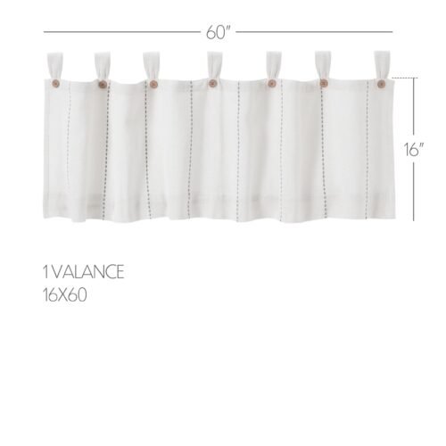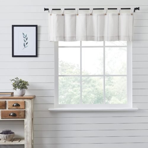 - Farmhouse Valance: 16 by 72-inch curtain conceals window hardware.