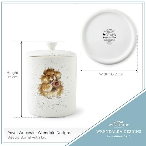 Discover this exquisite fine bone china biscuit barrel from Royal Worcester’s renowned Wrendale Designs collection. It showcases an adorable hamster design, skillfully painted by acclaimed artist Hannah Dale. The secure lid ensures your delicious biscuits remain fresher for longer.