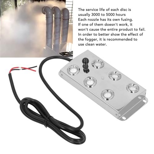 This Mist Maker Fogger is constructed from durable Stainless Steel. It features a maximum atomization amount of 4.5 liters per hour, utilizing 6 atomization cores. Its fog generation/consumption is approximately 5000mL / 5KG, covering an indoor area of 5㎡ and an outdoor area of 3㎡. The package includes 1 Ultrasonic Fogger. Please Note: Do not submerge the power supply directly into the water.